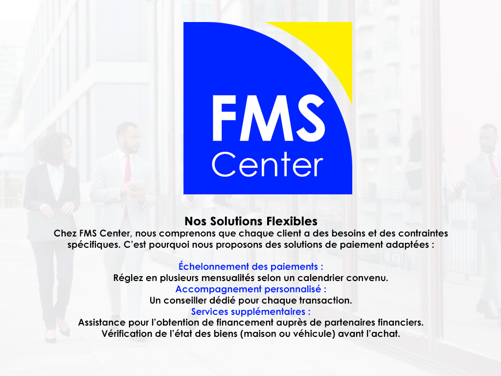 - Vente de Maisons Réalisez votre rêve de devenir propriétaire avec FMS Center . Une sélection de maisons modernes, traditionnelles ou sur plan, adaptées à différents budgets et besoins. Des options de paiement échelonné pour faciliter l’achat Assistance dans les démarches administratives et juridiques pour sécuriser la transaction..
